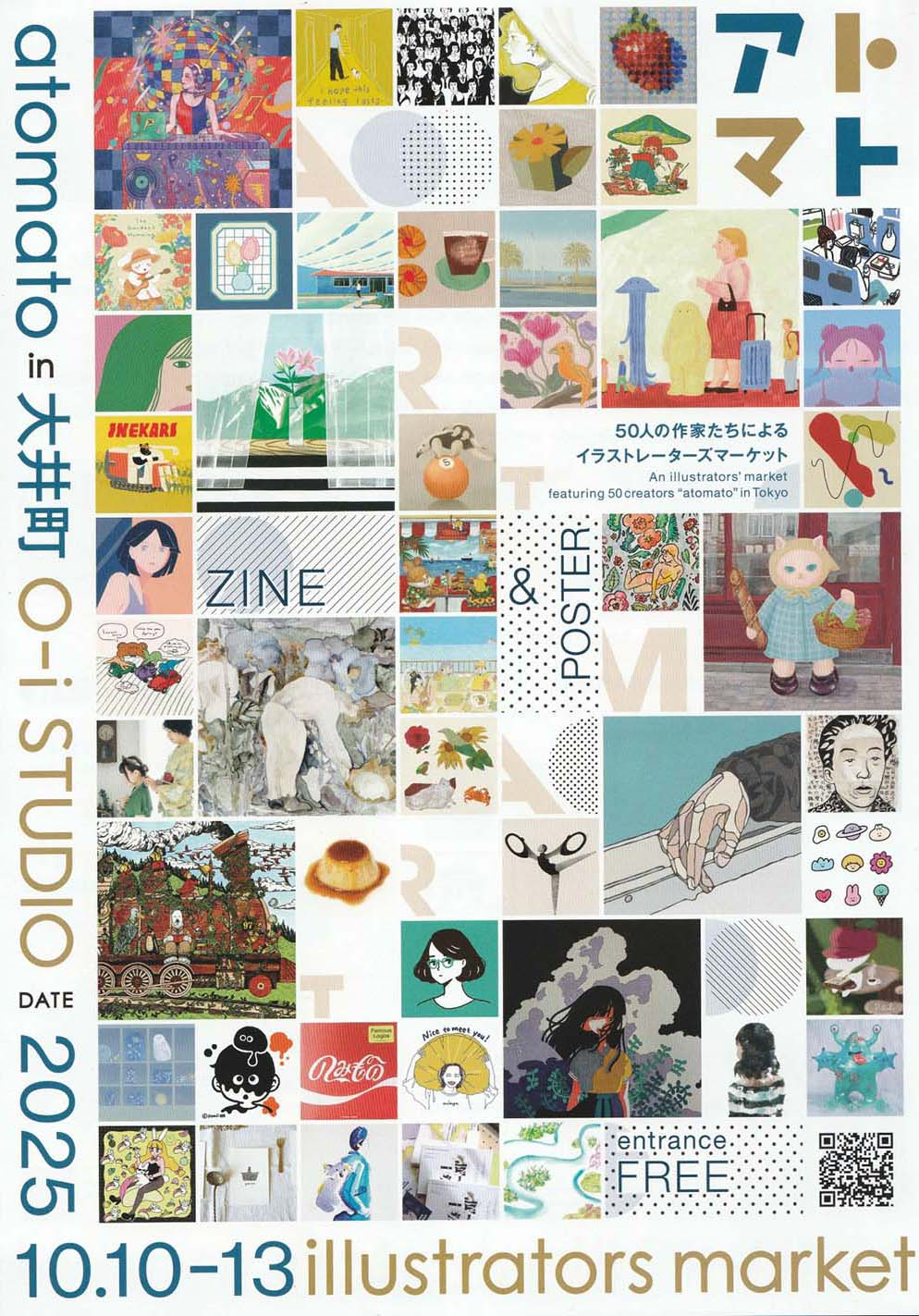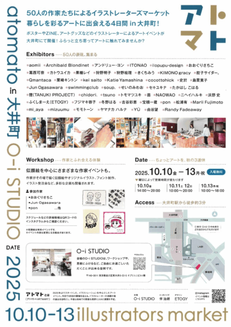大井町の「O-i STUDIO」で開催される「atomato in 大井町 2025(アトマト/ARTMART)」は、50人の作家によるイラストレーションマーケット。ポスター、ZINE、アートグッズなど多彩な作品が並び、似顔絵やライブドローイング、ワークショップなど、作家と直接ふれあえる体験型のアートイベントです。日常にアートを取り入れるきっかけになる4日間、ふらっと立ち寄ってお気に入りの作品を見つけてみては。