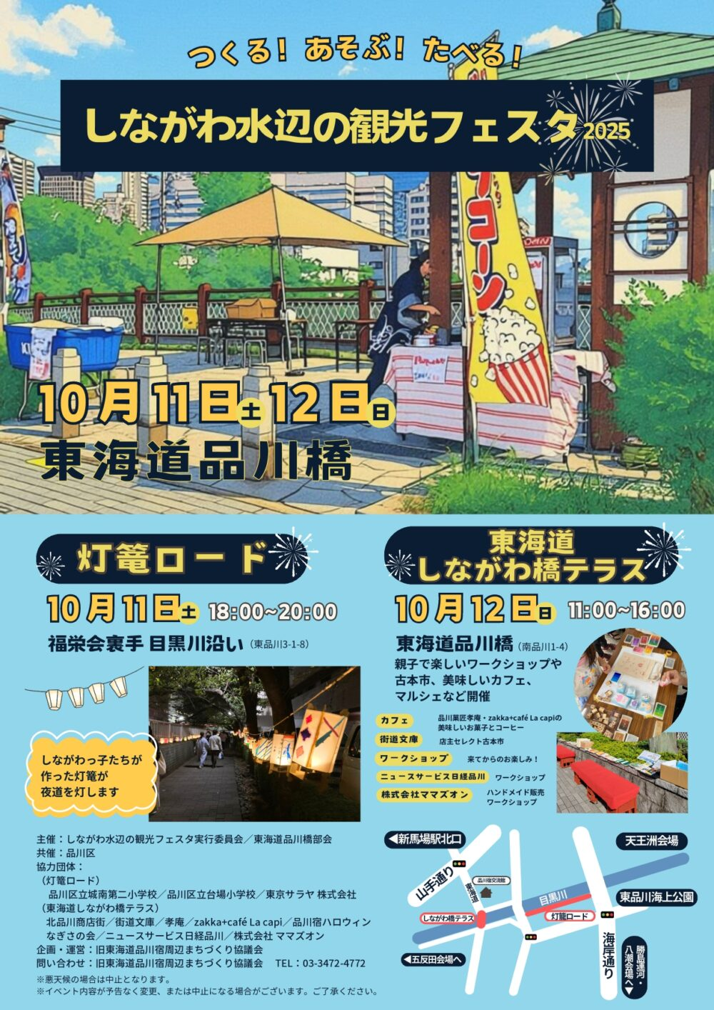 歴史ある東海道品川橋を舞台に、地域の温かみあふれるマルシェイベント「東海道しながわ橋テラス2025」が開催されます。古本市やカフェ、ハンドメイド雑貨販売、親子で楽しめるワークショップなど、のんびりと秋のひとときを過ごせる内容が盛りだくさん。地元で人気のショップやアーティストも出店し、まち歩きとともに楽しめる小さな文化フェスティバルです。前日の10月11日(土)には、近隣の子どもたちが手作りした灯籠が灯る「灯籠ロード」も開催。目黒川沿いが幻想的な光で包まれます。