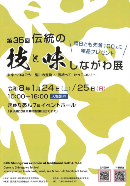 品川に受け継がれてきた伝統工芸と味の魅力を一堂に集めた恒例イベント「伝統の技と味 しながわ展」が、きゅりあんで開催されます。会場では、品川区伝統工芸保存会による職人の実演や作品展示を間近で見ることができ、ものづくりの奥深さを体感できます。さらに、季節の和菓子作りや江戸すだれ制作などの体験教室、商店街連合会厳選の名店が並ぶ「味の店」コーナーも登場。見て、知って、味わって、品川の魅力を未来へつなぐイベントです。