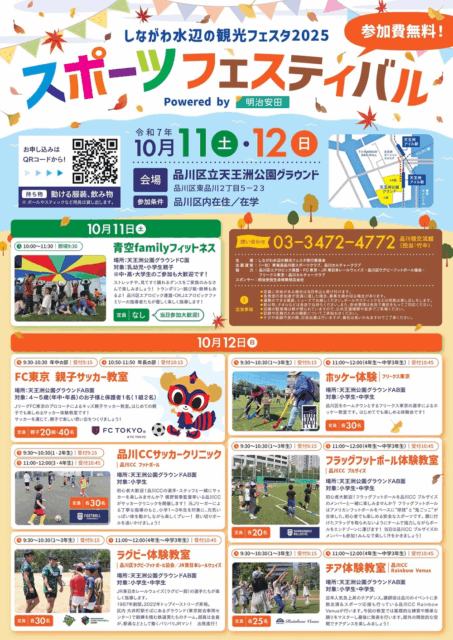 しながわ水辺の観光フェスタ2025の一環として開催されるスポーツフェスティバルは、天王洲公園グラウンドを舞台に行われる秋の体験型イベント。親子で楽しめるサッカー教室やホッケー、ラグビー、チアリーディング、フラッグフットボールなど、多彩なスポーツプログラムが勢ぞろい。初めてでも安心して参加できる内容で、地域の子どもたちや家族に大人気のイベントです。秋空の下で体を動かし、笑顔があふれる2日間を過ごしましょう。