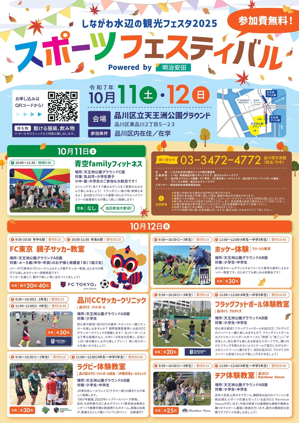 しながわ水辺の観光フェスタ2025の一環として開催されるスポーツフェスティバルは、天王洲公園グラウンドを舞台に行われる秋の体験型イベント。親子で楽しめるサッカー教室やホッケー、ラグビー、チアリーディング、フラッグフットボールなど、多彩なスポーツプログラムが勢ぞろい。初めてでも安心して参加できる内容で、地域の子どもたちや家族に大人気のイベントです。秋空の下で体を動かし、笑顔があふれる2日間を過ごしましょう。